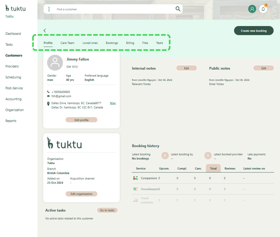 In the Customer Module, you can search for and view customer profiles. You can edit their profile, manage their care team, bookings, billing, and tasks, and add or remove related files.
