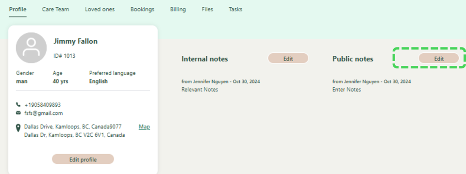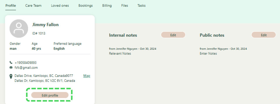 By selecting a customer, you can view and edit their profile, manage their care team, loved ones, bookings, billing summary, and tasks, and add or remove files related to the customer.