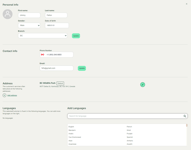 You can edit customer details by clicking 'Edit' beside the profile, updating Personal and Contact Info, and using the pen icon to modify or add addresses. You can also select applicable languages if the customer is bilingual. Once done, close the window to save your changes.