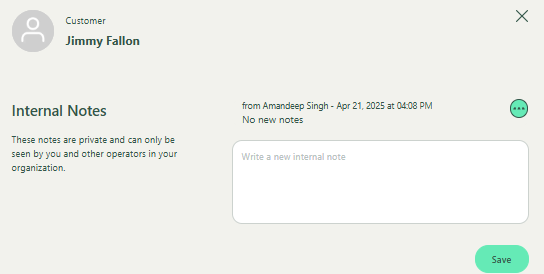 To edit a customer's Internal Notes, click Edit. Make the necessary changes and click Save. A sliding window will appear where you can enter relevant information and click Save. To delete a note, click Delete, and to exit the window, click the X button. Notes are sorted from newest to oldest. You can also edit, pin, or delete a note by clicking the three-dot button beside it.