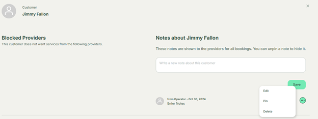 To edit a customer's Public Notes, click Edit beside Public Notes to add notes visible to both customers and providers. A sliding window will appear where you can enter relevant information and click Save. You can also edit, pin, or delete a note by clicking the three-dot button beside it. Notes can be shared with specific providers as well as customers. To exit the window, click the X button.