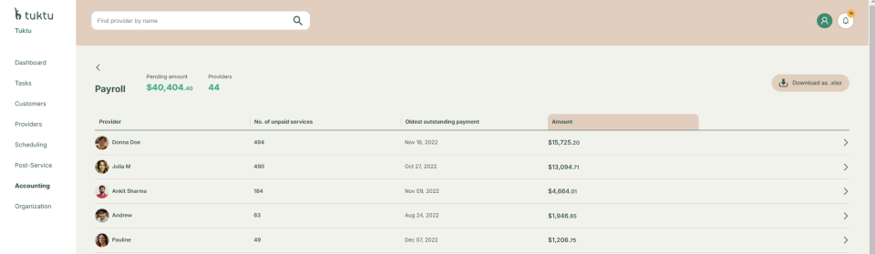 User Manual Accounting Dashboard Navigate the dashboard View tasks Search for tasks Create a new task Create new booking Customers Search for Customers Add New Customers Manage Customer Details Manage Care Team Manage Bookings Manage Billings Add & Edit Loved Once Manage Files and Tasks Providers Search for Providers Manage Providers Profile Manage Providers Availability Manage Providers Bookings View and Edit Training and Certificate Manage Providers Payments View & Manage Provider Files View and Edit Provider Tasks Scheduling Search and View Bookings Book Appointments Modify Bookings Cancel Bookings Apply Discounts Add Notes to Bookings Scheduling Videos Accounting Access Accounting Managing Customer Invoices Review & Generate Invoices Handle Disputes Manage Group Invoices Manage Provider Payments Manage Vendor Payments Accounting Videos Post Operations View & Navigate Post Service Bookings Modify Completed Bookings Manage Expenses & Payments Add Customer Feedback Add Provider's Feedback Organization View Organization Create Branch View User List Add User Manage Provider Payments How to manage provider payments? Step 1 Click on Provider Payments. The screen displays outstanding payments owed to service providers. You can view the pending amount and providers. Step 2 If needed, download Payment Summary for record-keeping.