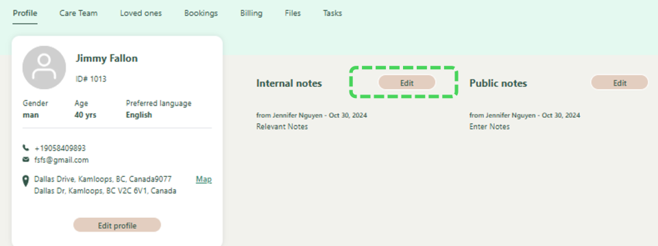 Once the customer profile loads, Click the Edit button next to add Internal Notes related to the customer. ** Please note, Internal notes are intended for internal communications of communications that you don’t wish to share with the client/ customer/ provider.