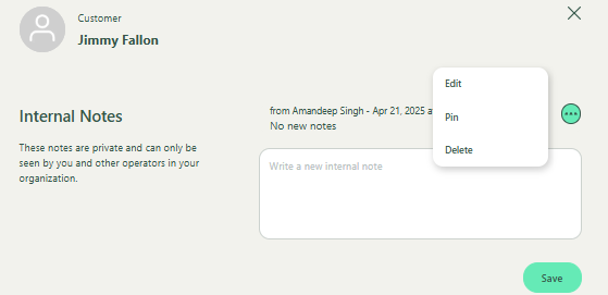 To edit a customer's Internal Notes, click Edit. Make the necessary changes and click Save. A sliding window will appear where you can enter relevant information and click Save. To delete a note, click Delete, and to exit the window, click the X button. Notes are sorted from newest to oldest. You can also edit, pin, or delete a note by clicking the three-dot button beside it.