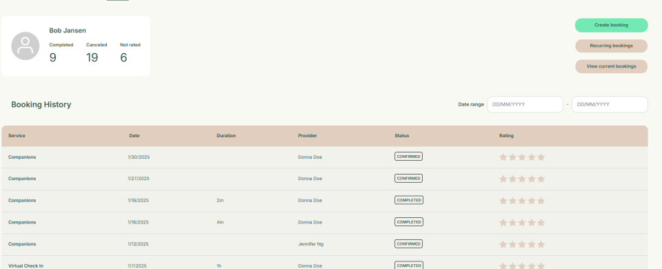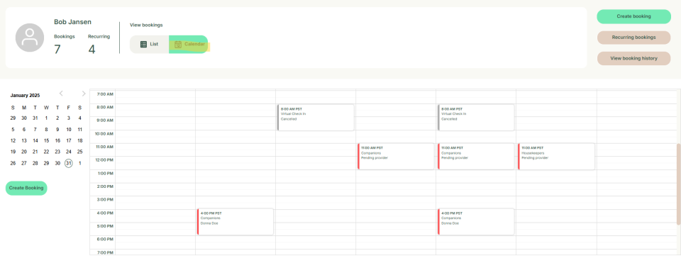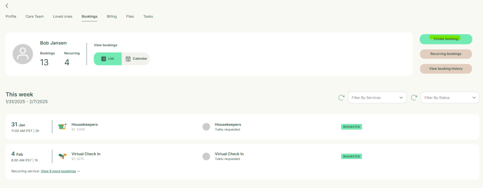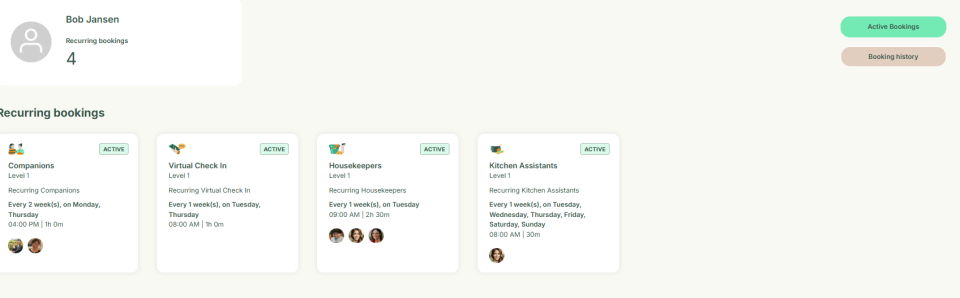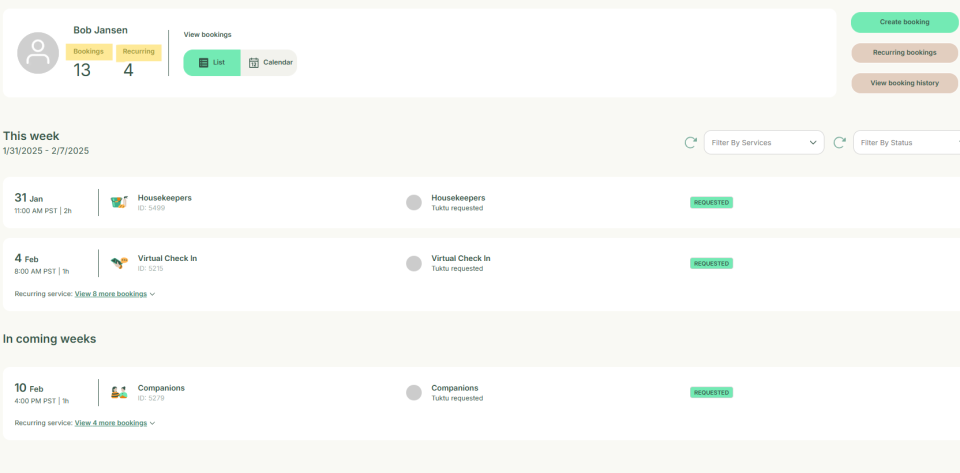 This section explains how to manage customer bookings through their profile. It allows you to create new bookings, view past booking history, and see upcoming services and schedules for the coming weeks