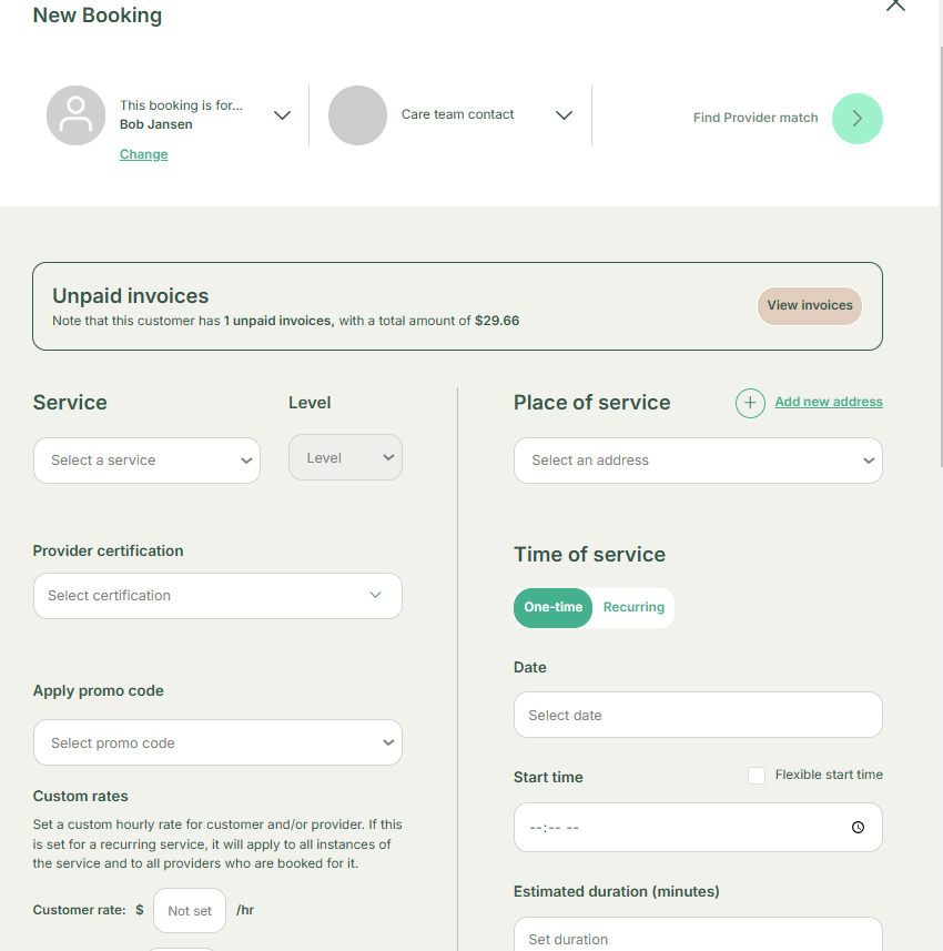 To create a booking, click "Create Booking", fill in service details, and select "Find Provider Match". If a 100% match is found, confirm the booking. Otherwise, choose an alternative provider or broadcast the request. If a provider accepts, they confirm the appointment, and the customer is notified.