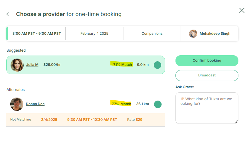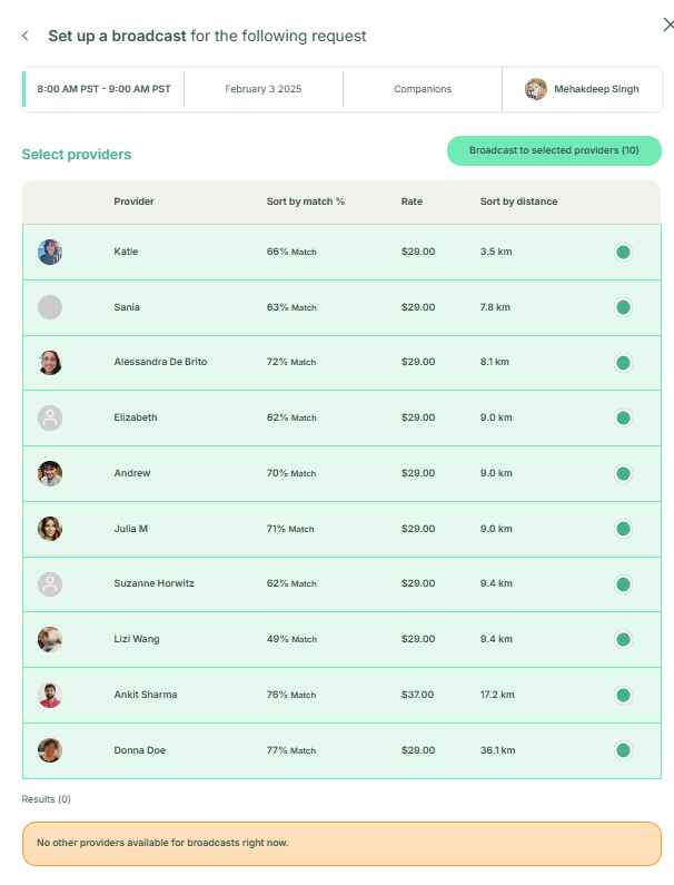 However, if the operation wants to see other options available, they can broadcast it by clicking on Broadcast option. The provider will send out the broadcast to these people and once the provider decide to take on the appointment, they will click on confirm and then the customer will be sent to the customer