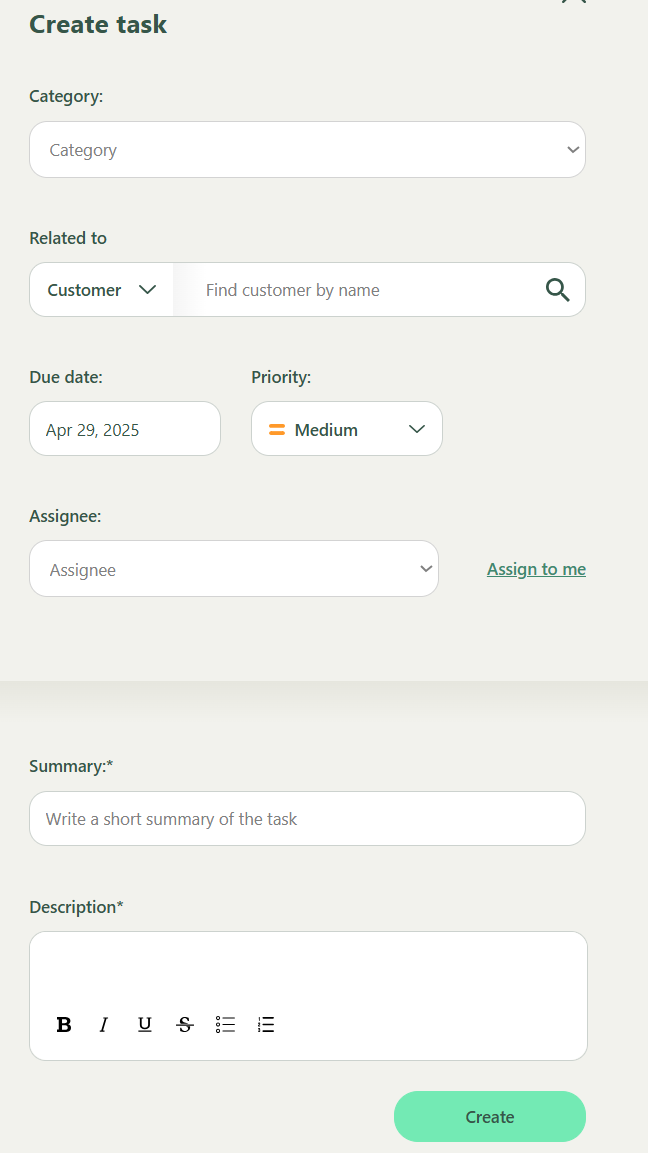 User Manual Dashboard Dashboard Navigate the dashboard View tasks Search for tasks Create a new task Create new booking Customers Search for Customers Add New Customers Manage Customer Details Manage Care Team Manage Bookings Manage Billings Add & Edit Loved Once Manage Files and Tasks Providers Search for Providers Manage Providers Profile Manage Providers Availability Manage Providers Bookings View and Edit Training and Certificate Manage Providers Payments View & Manage Provider Files View and Edit Provider Tasks Scheduling Search and View Bookings Book Appointments Modify Bookings Cancel Bookings Apply Discounts Add Notes to Bookings Scheduling Videos Accounting Access Accounting Managing Customer Invoices Review & Generate Invoices Handle Disputes Manage Group Invoices Manage Provider Payments Manage Vendor Payments Accounting Videos Post Operations View & Navigate Post Service Bookings Modify Completed Bookings Manage Expenses & Payments Add Customer Feedback Add Provider's Feedback Organization View Organization Create Branch View User List Add User Create a New Task Step 1 Users can create a new task by following these steps Select the Relevant Category Set the Due Date Assign Priority Assign the Task Enter Task Summary and Relevant Description Create the Task