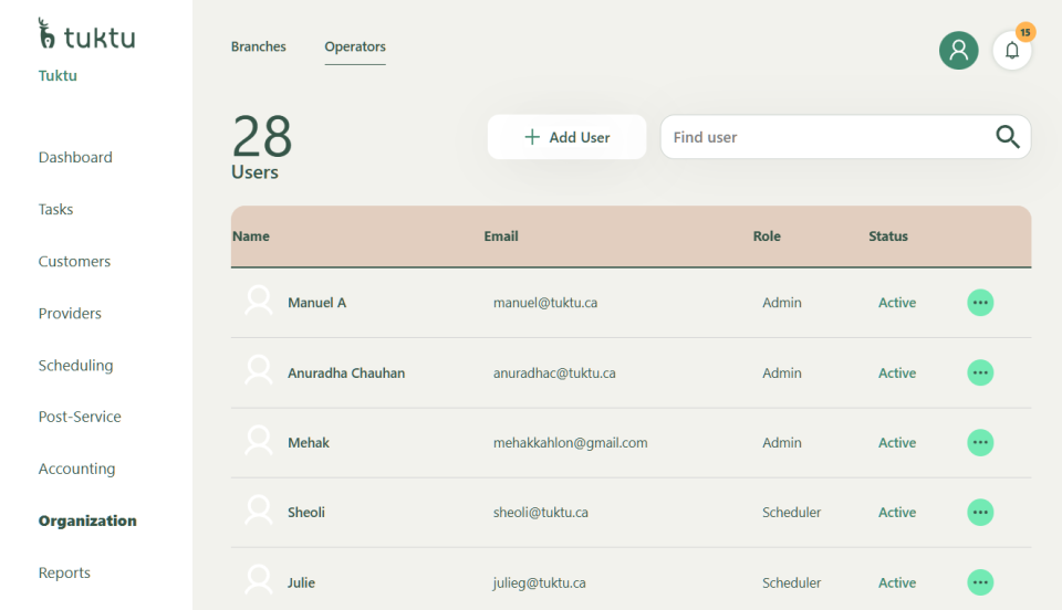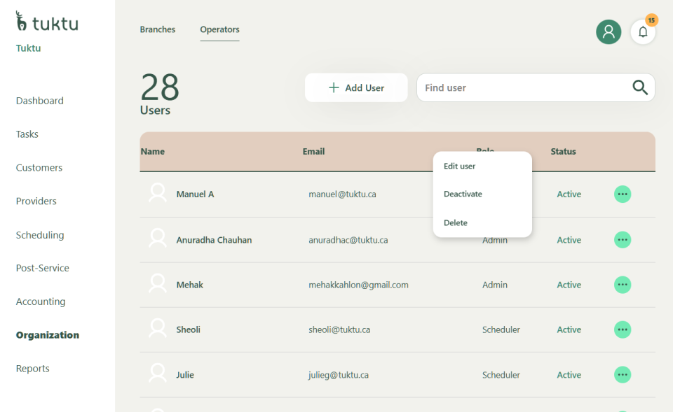 To make any changes, User can click on the 3 green dot to see the options to: Edit, Deactivate, or Delete the operators / Admin