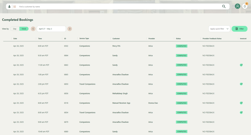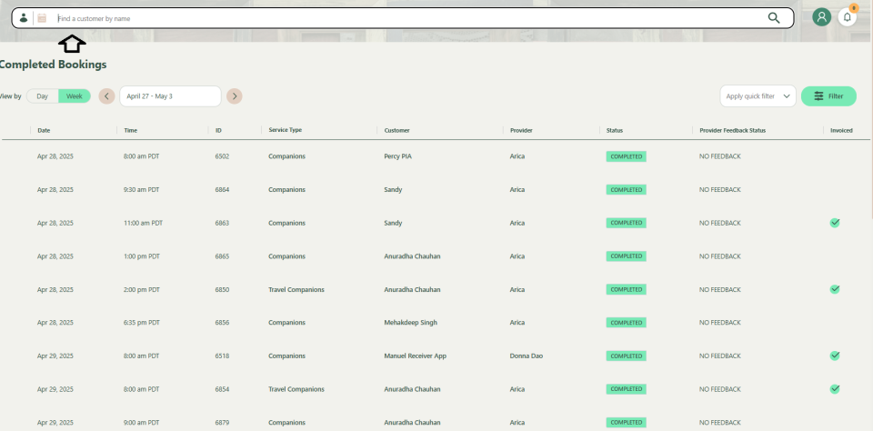 Enter the name of the customer to view the list of completed bookings