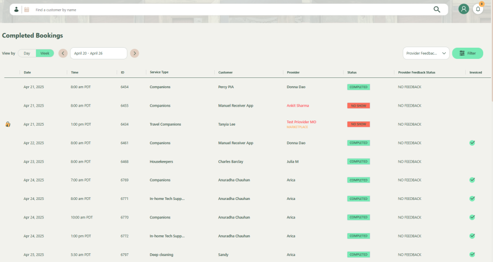 To filter bookings with missing provider feedback, click Post Service and select the ‘Provider Feedback Missing’ filter from the right panel. Open the filter menu using the three dots and refine your search by appointment status, service type, organization, and date range. Click Apply to view the filtered results.