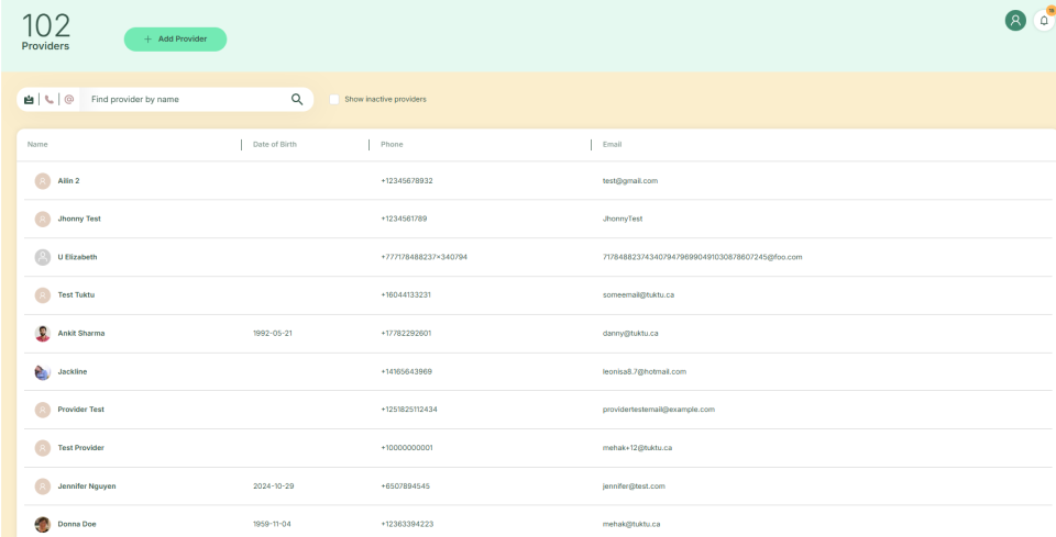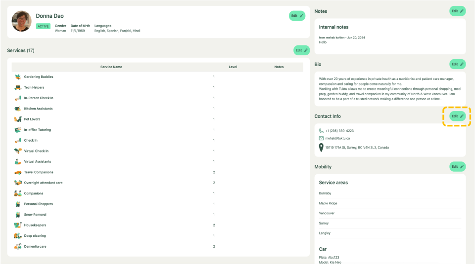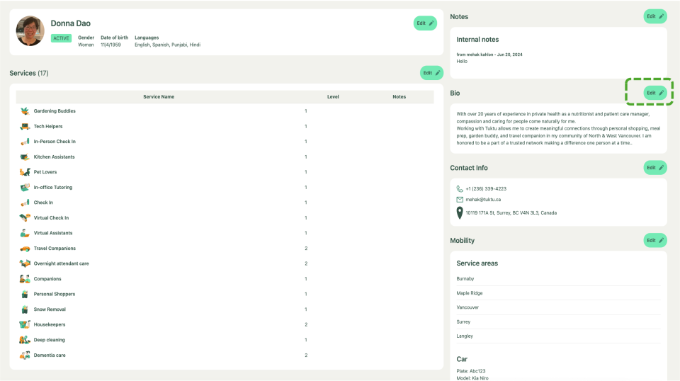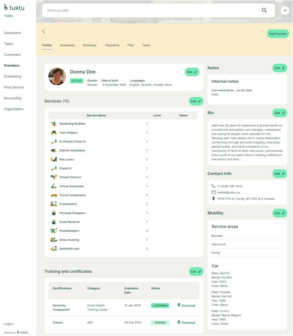 To edit a provider's profile, first click on their name from the list. Once inside, you can update their services, bio, contact information, internal notes, service area, vehicle details, and add relevant documents such as training or certifications.
