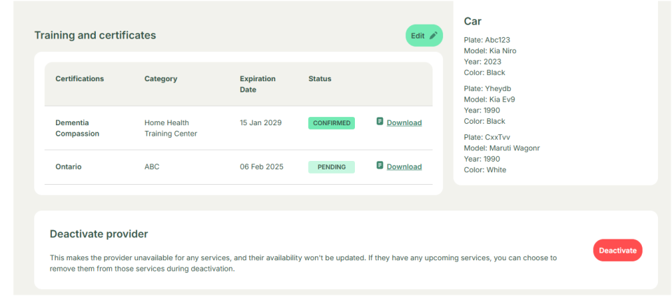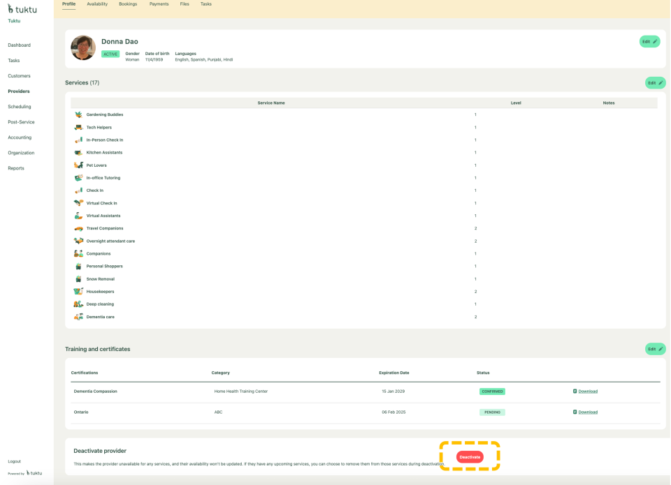 Click on Deactivate button on the bottom right to deactivate a provider to make them unavailable for any services. If they have any upcoming services, this button will remove them from all those services.