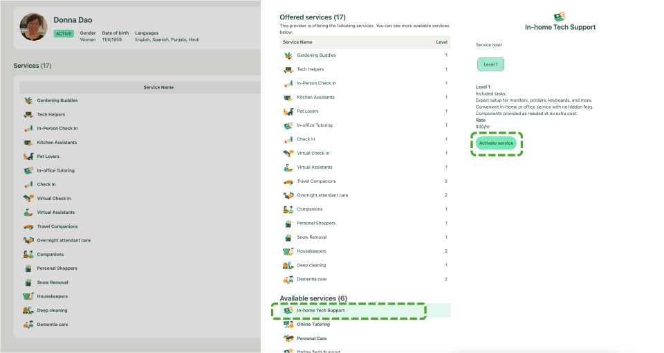 In the provider profile, click the "Edit" icon near the Services header. To add a service, click "Activate Service" at the bottom, ensuring the provider's address is valid. To deactivate a service, click the service and press the red "Deactivate Service" button.