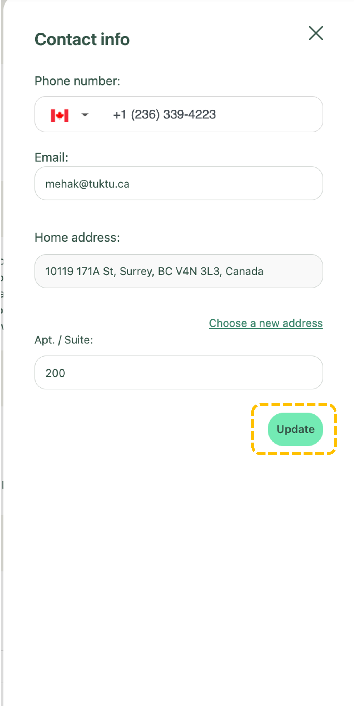 Once you click on “edit , a window will slide out. You can update your phone number and email. If you need to change address, simply click “choose a new address” and then search for your new address. Click update after you're done with the edits.