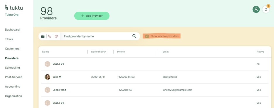 Click the Show Inactive Providers check box. Notice the column Active Status = no for inactive providers.