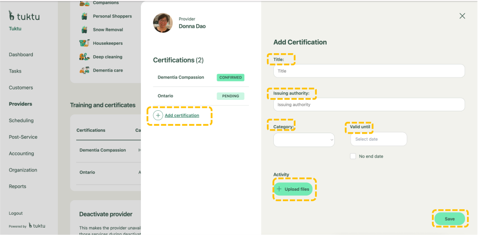 category, valid until (date), add a copy of certification. Once done, click on save
