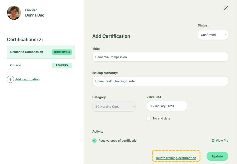 Note: You can also delete the training/ certification here by clicking on the link next to the “UPDATE” button.